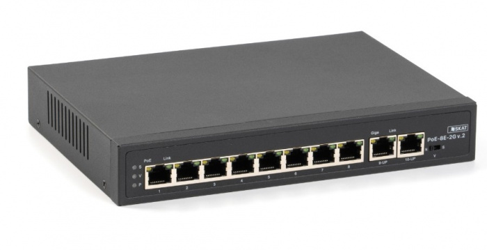 SKAT PoE-8E-2G v.2 представляет собой специализированный неуправляемый PoE коммутатор для использования в системах видеонаблюдения и безопасности. Характеризуется высокой надежностью работы благодаря защите от электростатических разрядов и перепадов напряжения, позволяет организовать качественную передачу информации в сети Ethernet.