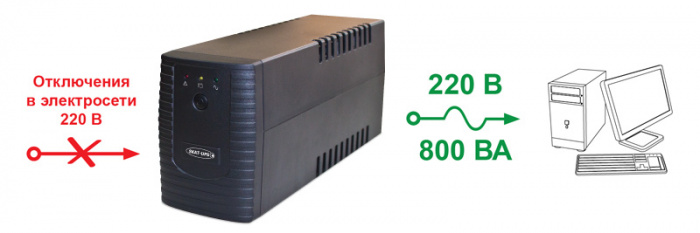 - Питание персональных компьютеров (ПК) или другой нагрузки с номинальным напряжением питания 220 В переменного тока и потребляемой мощностью до 800 ВА (480 Вт) (режим основной);