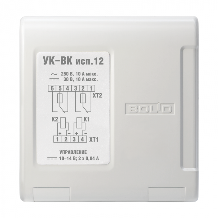 Устройство "УК-ВК" применяется в системах охранно-пожарной сигнализации и предназначено для управления подключением и отключением приборов, входящих в состав систем охранно-пожарной сигнализации, и коммутацией исполнительных устройств (ламп, сирен, видеокамер, систем пожаротушения, электромагнитных замков и т.д.) к сети переменного тока номинальным напряжением 220 В или источнику постоянного тока до 30 В путем замыкания и размыкания контактов реле.