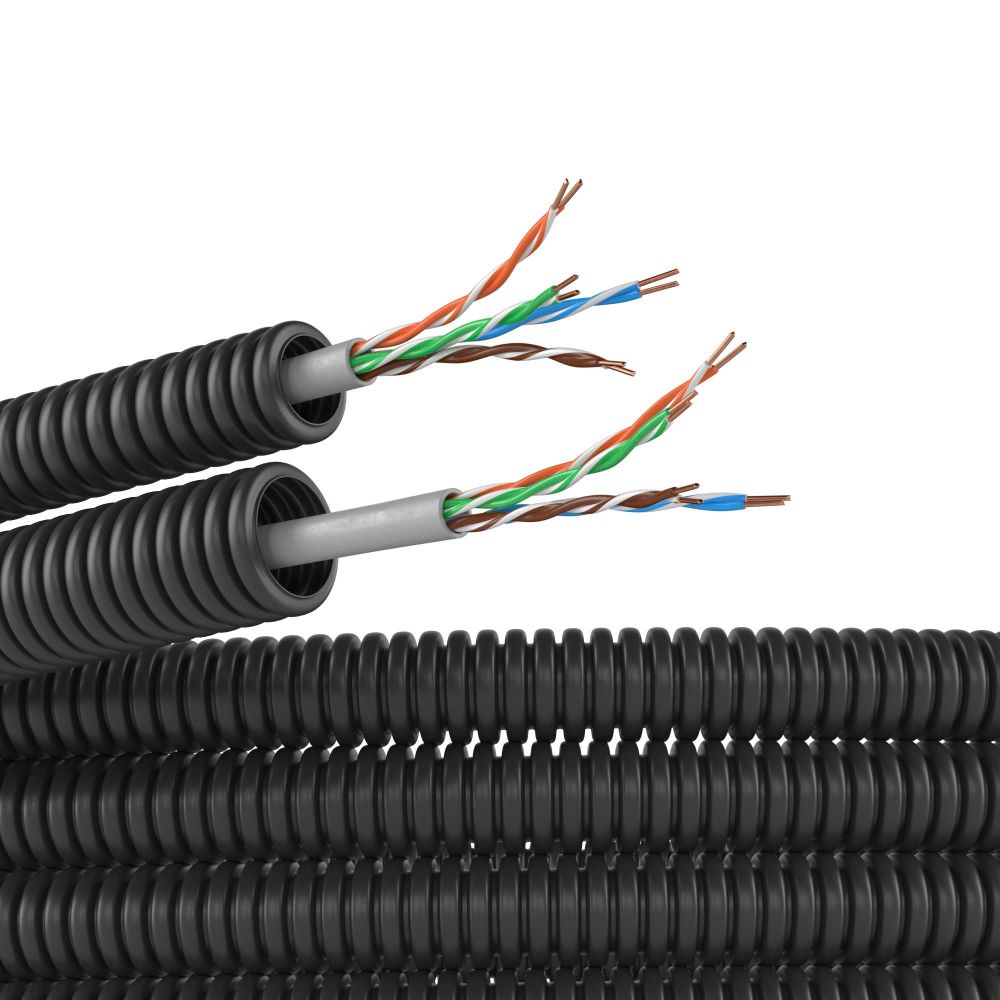 Электротруба ПНД гибкая гофрированная д. 16 мм, цвет черный, с кабелем витая пара 5EU/UTP нг(А)-HF, 50 м подробнее
