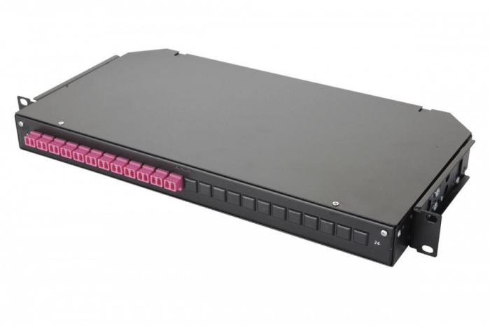 Коммутационная панель 19'' 1U, корпус 24 адаптера, укомплектованная: адаптеры 4 x duplex LC OM4 + пигтейлы LC/PC + сплайс-кассета + КДЗС, 50/125 OM4