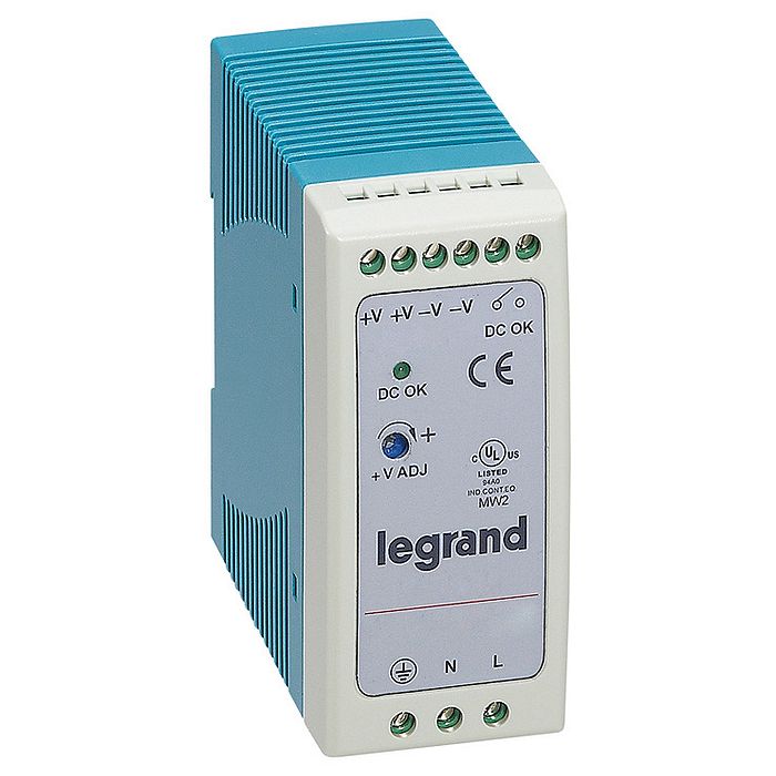 Однофазный стабилизированный импульсный источник питания на 12 В., номинальная мощность 20 Вт, номинальный ток 1.6 А. Светодиодный индикатор наличия выходного напряжения. Потенциометр на передней панели для регулировки выходного напряжения. Монтаж на рейку DIN глубиной 7,5 и 15 мм.
