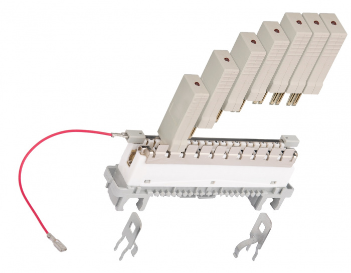 Для предохранения активного оборудования и кабельных линий от скачков напряжения рекомендуется использовать специальную защиту. Модуль защиты NMC-PL-UP1-10 предназначен для обеспечения комплексной защиты оборудования на телефонной линии от кратковременных скачков тока и напряжения. Каждый модуль защищает 1 пару и устанавливается исключительно в размыкаемые плинты NMC-PL10-Dx-10. Модули используются совместно с набором заземления NMC-PL-GND-KIT-10. При установке на плинт, ножки шины замыкаются на кронштейнах. В случае, если плинты смонтированы на круглых направляющих, для заземления конструкции потребуются клипсы NMC-PL-EC-10. Клипс необходимо по две штуки на каждый плинт.