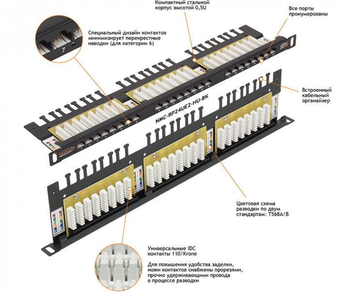 Универсальные IDC контакты 110/KRONE расположены с тыльной стороны панелей, на горизонтальной подложке. Заделка патч-панелей производится вертикально, по стандарту T568A/B.