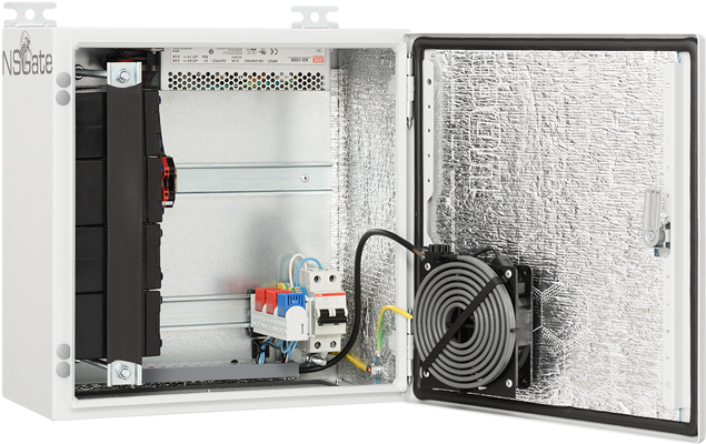 Базовая механическая и электрическая комплектация включает в себя комплект настенного крепления, монтажную панель с DIN-рейками для клиентского оборудования, проходные клеммы, двухполюсный автомат, шину заземления, вентилятор с термостатом, согласованный с заказчиком комплект кабельных вводов и систему бесперебойного питания. Система питания определяется выбранной моделью NSBox-UPS и включает ИБП с монтажным комплектом для батарей 7Ач | 15Ач | 45Ah. Кабельные вводы установлены в нижней части шкафа, например, на съемной металлической пластине для стального шкафа. Для надежной работы при низких температурах используйте тепловентилятор (опция NSBon-18).