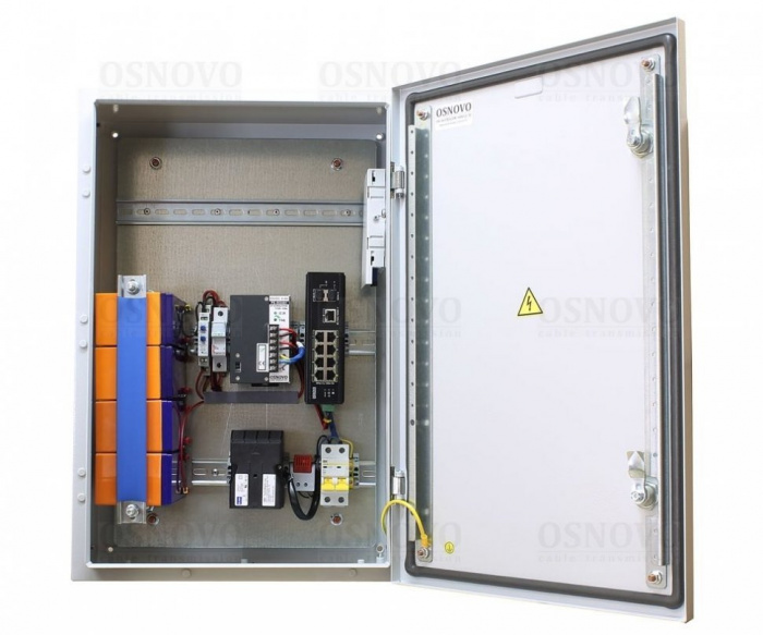 OSNOVO OS-46TB3(SW-80802/ILS(port 75W)) - Уличный управляемый (L2+) коммутатор на 10 портов с термостабилизацией, грозозащитой портов PoE, резервным питанием и функцией мониторинга температуры/влажности/напряжения на базе уличной станции OS-46TB1. Порты: 1 x GE (10/100/1000Base-T) с PoE (до 75W, IEEE 802.3bt) + 7 x GE (10/100/1000Base-T) с PoE (до 30W) + 2 x GE SFP (1000Base-X). Суммарный бюджет PoE до 240W. Металлический шкаф (ШxВxГ): 400х600х210мм, питание AC195-265V. АКБ 48В(7Ач)), оптический кросс, исполнение IP66. Рабочая температура (температура окружающей среды): -60…+50°С, температура внутри станции -10…+55°С
