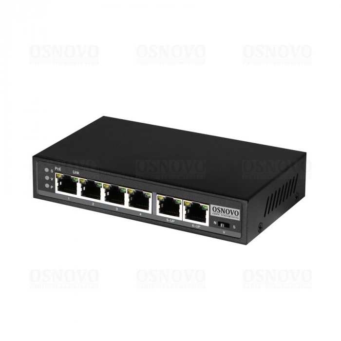 PoE Коммутатор/ удлинитель Fast Ethernet на 6 портов с питанием по PoE. Порты: 4 х FE (10/100 Base-T) с поддержкой PoE, 1 x FE (10/100 Base-T) Uplink с поддержкой питания по PoE (до 90W), 1 x FE (10/100 Base-T) Uplink. Соответствует стандартам PoE IEEE 802.3af/at. Автоматическое определение PoE устройств. Мощность PoE на порт - до 30W. Суммарная мощность PoE - до 87W. Поддержка режима CCTV: Увеличение расстояния передачи данных до 250м, изоляция портов. Встроенная грозозащита - 3kV. Питание: По порту FE (10/100 Base-T) Uplink. Размеры (ШхВхГ): 140 x 28 x 80 мм. Рабочая температура: -10...+55 гр. С.