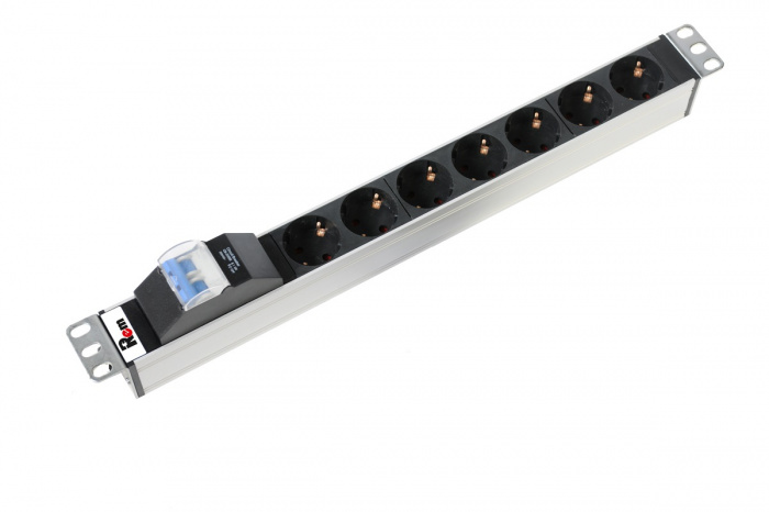 Блок силовых розеток имеет семь портов стандарта Schuko, выполнен в анодированном  алюминиевом корпусе. Розетки расположены под углом 45%, для удобного подсоединения коленчатых штекеров. Блок имеет автомат защиты 16А. Для подключения питания предусмотрена клеммная колодка для кабеля номинальным сечением  до 2,5 м2. Блок совместим со всеми линейками 19” монтажного оборудования.  Поставляется в индивидуальной упаковке с комплектом крепежа. Выполнен в системе несущих конструкций 482,6 мм по ГОСТ 28601.2 (19-дюймовые конструктивы по МЭК 297).