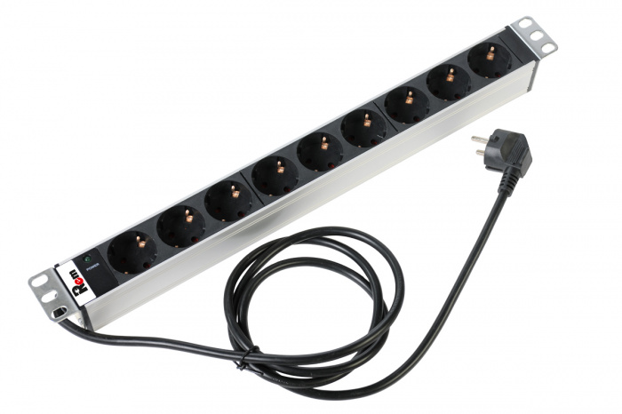 Блок силовых розеток имеет девять портов стандарта Schuko, выполнен в анодированном алюминиевом корпусе. Розетки расположены под углом 45%, для удобного подсоединения коленчатых штекеров. На лицевой части блока установлен индикатор питания. Кабель питания 3 метра. Совместим со всеми линейками 19” монтажного оборудования.  Поставляется в индивидуальной упаковке с комплектом крепежа. Выполнен в системе несущих конструкций 482,6 мм по ГОСТ 28601.2 (19-дюймовые конструктивы по МЭК 297).