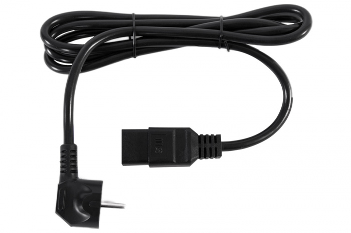 Шнур (кабель) выполнен из ПВХ черного цвета, имеет опрессованную розетку IEC 60320 C19 и вилку Schuko. Кабель состоит из трех многожильных проводов сечением 1.5 мм2, имеет заземление. Номинальный ток нагрузки: 16А. Номинально напряжение: 220-250 В. Длина кабеля 1.8 метра.