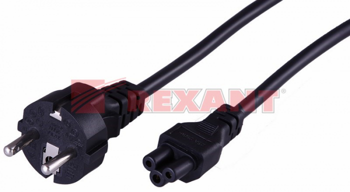 Шнур сетевой Евро 3х0.75мм² 1.8М (PVC) (с заземлением) (ноутбук) REXANT предназначен для подключения к сети переменного тока (AC) с напряжением 220B портативных компьютеров, ноутбуков, проекторов и других устройств, имеющих штыревой разъём типа C6. Данный шнур сетевой Евро (IEC cord) оснащен с одной стороны неразборной литой вилкой (евростандарт) с заземляющим контактом, с другой литым трёхконтактным гнездовым разъёмом типа C5 (в обиходе называют «Микки Маус» или листом клевера) и трехжильным проводом с сечением жил 0.75мм². Основные характеристики:
