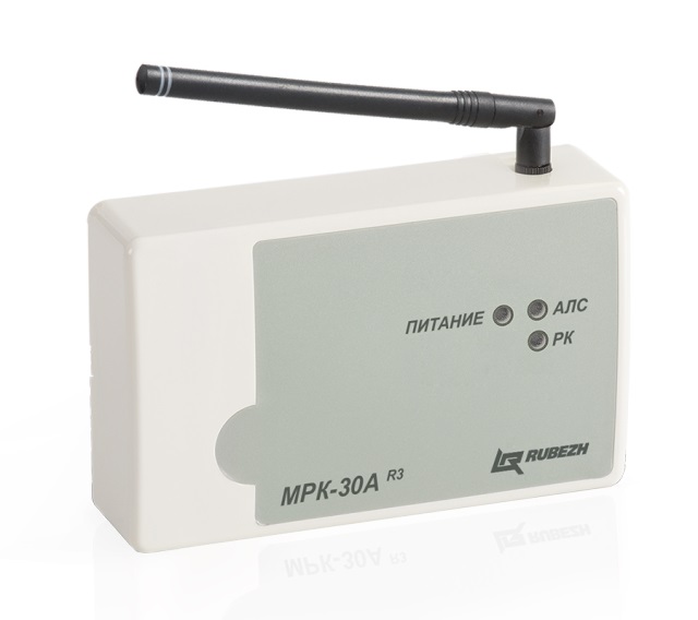 Модуль радиоканальный МРК-30А прот. R3 получает сигналы управления от приемно-контрольного прибора. Сам модуль работает с устройствами системы «Aleksa» и позволяет задействовать их в работе адресной системы на основе прибора Рубеж-2ОП прот. R3.