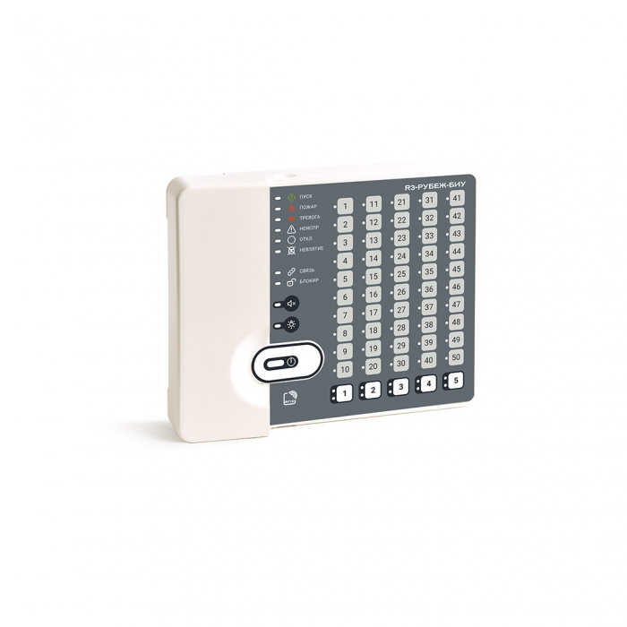 R3-Рубеж-БИУ имеет на каждой странице 50 трехцветных световых индикаторов (красный, зеленый, желтый) с привязкой каждого индикатора к контролируемой зоне, группе зон или исполнительному устройству.