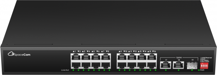 SpaceCam неупр. коммутатор (SC-16P-285-2G-1G(A)), 16 PoE 10/100Мбит/с + 2 10/100/1000Мбит/с RJ45 + 1 SFP 1000Мбит/с, 285 Вт