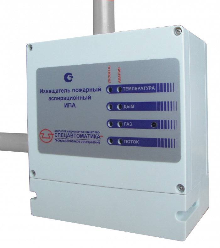 Извещатель пожарный аспирационный ИПА предназначен для защиты объектов (зданий, сооружений, тоннелей, кабельных каналов и др.) от пожаров, в том числе тех, где возможно пребывание людей (учреждений, квартир, торговых помещений, складов, гаражей и т.д.) и управления автоматическими средствами пожаротушения путем забора из защищаемого объекта газовоздушной смеси, взаимного корреляционного анализа сопутствующих развитию процесса факторов (повышение концентрации газов однозначно свидетельствующих о возникновении очага возгорания) и (или) оптической плотности газовоздушной среды (например, возникновения дыма)), формирования уровней опасности во внешние цепи, отключения системы вентиляции и управления запуском модулей пожаротушения с помощью сигналов «Норма», «Тревога 1», «Тревога 2», «Пуск», «Пуск 30 с», «Авария».