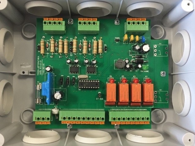 Концентратор управляющий-4 с RS-интерфейсом (КУП-4RS) - подключается к КУН-IPМ, КЦС-IPМ, КУН-2Д.1, КУН-2ДМ, КЦС. Содержит 4 канала для управления типа сухой контакт (обычное реле, мах.напряжение 250В, ток 2А), 6 входов для подключения дискретных датчиков (в т.ч 4 входа для контроля напряжения 110/220В).