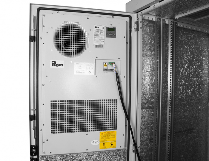 Система климат-контроля REM, установленная на передней двери шкафа, представляет собой кондиционер мощностью от 1000 до 2000 Вт с нагревателем, имеющим мощность по теплу от 500 до 1000 Вт.