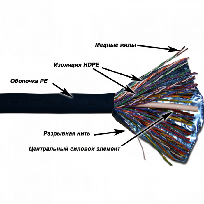 Витые пары собраны вокруг центрального элемента и заключены в общую оболочку из полиэтилена(PE).