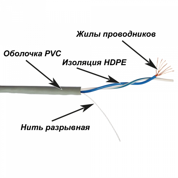 Два проводника, скрученных со специально подобранным шагом и составляющих одну витую пару, заключены в общую оболочку из ПВХ (PVC).
