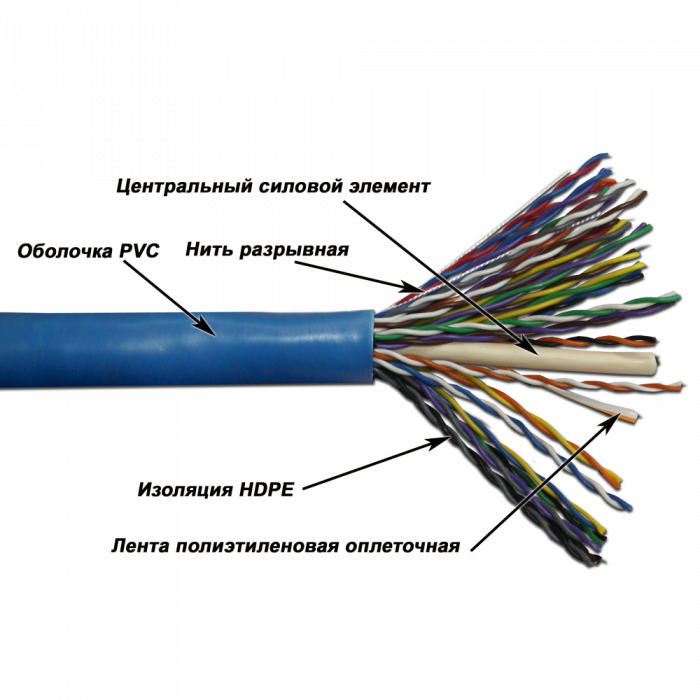 Витые пары собраны вокруг центрального элемента, обернуты полиэтиленовой пленкой и заключены в общую оболочку из ПВХ (PVC).