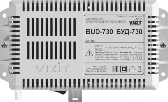 Vizit БУД-730 - Блок управления  используется совместнос блоками вызова серии 700 (БВД-733х, БВД-740х) в составе многоквартирных домофонови видеодомофонов . Емкость до 400 абонентов.Возможность подключения Ethernet модуля VEM-701(V) и GSM модуля VSM-792.  Напряжение питания 190-240VAC.