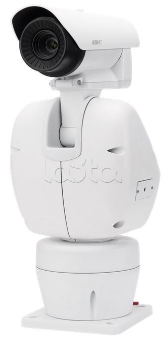 IP тепловизор уличный на поворотной платформе платформе; разрешение 640х480, 30кадр/сек. (H.265/H.264/MJPEG), поддержка WiseStream II; неохлаждаемый микроболометр 17㎛, тепловая чувствительность 50mK, фиксированный объектив 19 мм (F1.0); горизонтальный угол обзора 32°/ верт. 24.3˚; углы поворота 360˚ бесконечно / наклона -90˚ ~ 40˚, скорость поворота: 0.025˚/сек ~ 120˚/сек, наклона: 0.025˚/сек ~ 40˚/сек; поддержка до 300 пресетов, точность пресета 0.3˚; доп. аналоговый видео выход CVBS : 1.0 V / 75Ω (720x576); детектор движения 8 зон (8-ми точечный), передача сигнала управления на поворотную IP камеру (Handover); цифровая стабилизация изображения с гиросенсором: встроенная видеоаналитика (праздношатание, направление движения, виртуальная линия, детектор оставленных/похищенных предметов, вход/выход из зоны, детектор внешнего воздействия, детектор удара); детектор изменения температуры; аудиоаналитика (выстрел, разбитие стекла, взрыв, громкий крик); сетевой порт RJ-45 10/100 Base-T Ethernet; аудио: 1вх / 1 вых., кодек сжатия звука G.711 u-law /G.726 Selectable; G.726 (ADPCM) 8KHz, G.711 8KHz; G.726 : 16Kbps, 24Kbps, 32Kbps, 40Kbps; AAC-LC : 48Kbps at 8/16/32/48KHz; тревожные входы/выходы: 1/1; слот для карт записи SD/SDHC/SDXC (до 256ГБ), поддержка NAS и прямой записи на ПК; поддержка ONVIF Profile S/G, SUNAPI (HTTP API), Open Platform; питание AC 24V, Max. 84W; -40°C ~ +60°C; 219×528×335 мм, вес 11,7 кг., IP66, NEMA 4X, IK10; алюминиевый корпус.
